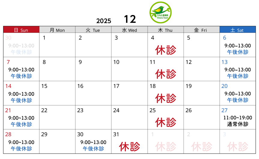 2025.12月度診療日のお知らせ